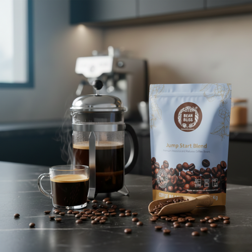 Fuel your day with the powerful taste of Bean Bliss Jumpstart Coffee Beans Blend, a carefully crafted combination of high-quality Arabica and Robusta beans designed for those who love strong, full-bodied coffee with an energizing kick.