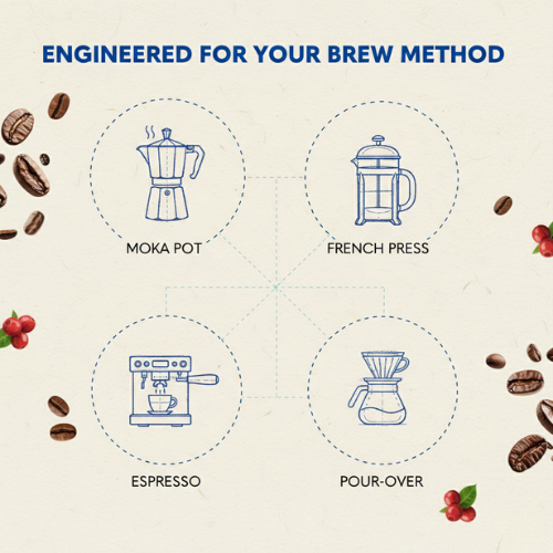 This premium blend brings together the smooth aroma and natural sweetness of Arabica with the bold strength and higher caffeine content of Robusta. The result is a rich, intense cup with deep flavor notes, a thick crema (perfect for espresso), and a long-lasting, satisfying finish.
