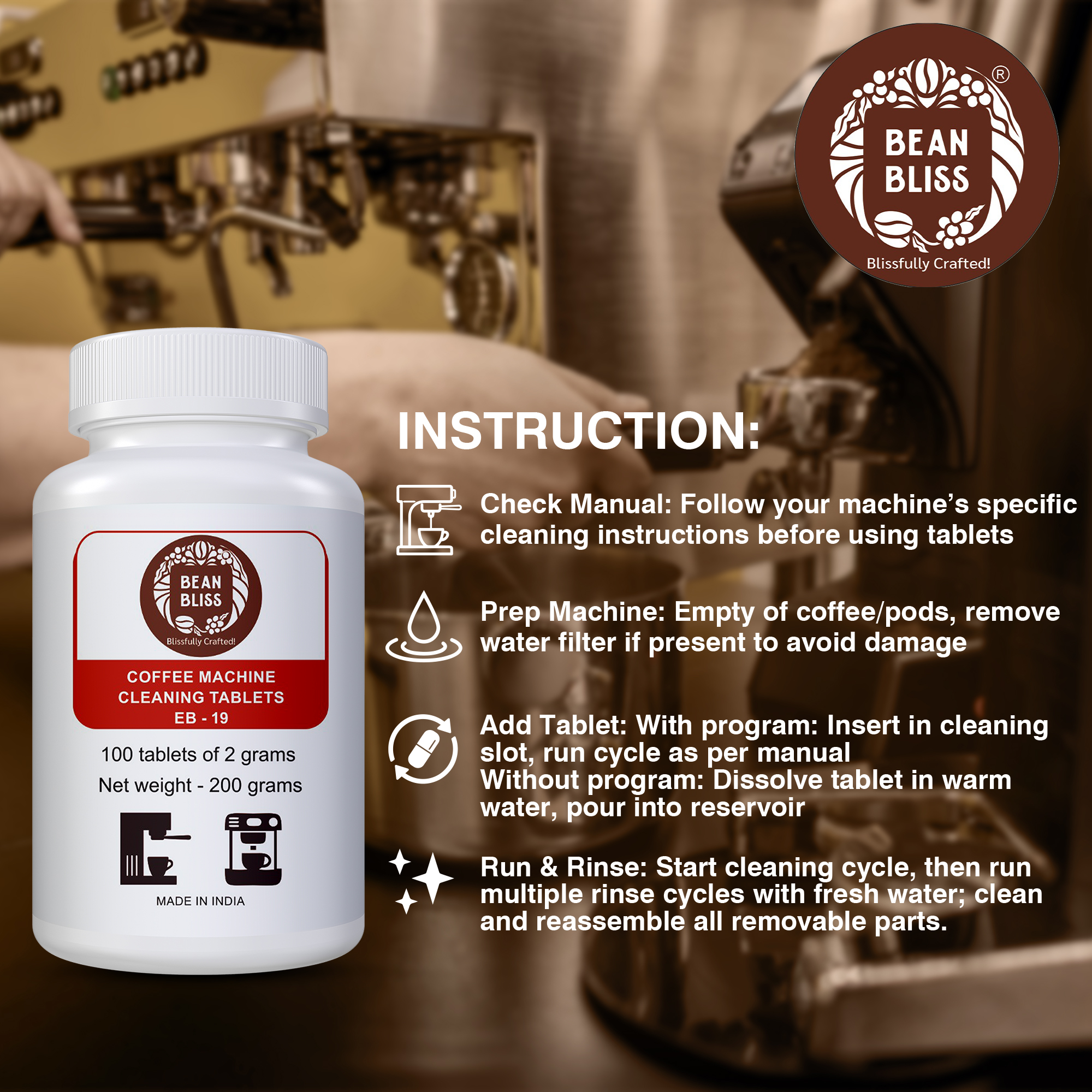 The Bean Bliss Coffee Machine Cleaning Tablets (100 x 2g) are specially formulated to remove coffee oils, residue, and build-up from espresso machines, ensuring optimal performance and longevity. Designed for easy and effective cleaning, these tablets help maintain the taste and quality of your coffee while preventing clogging and machine wear. Suitable for use with a wide range of automatic and manual coffee machines, they dissolve quickly for a hassle-free cleaning process. Keep your coffee equipment in top condition with Bean Bliss Coffee Machine Cleaning Tablets for a consistently fresh and flavorful brew.